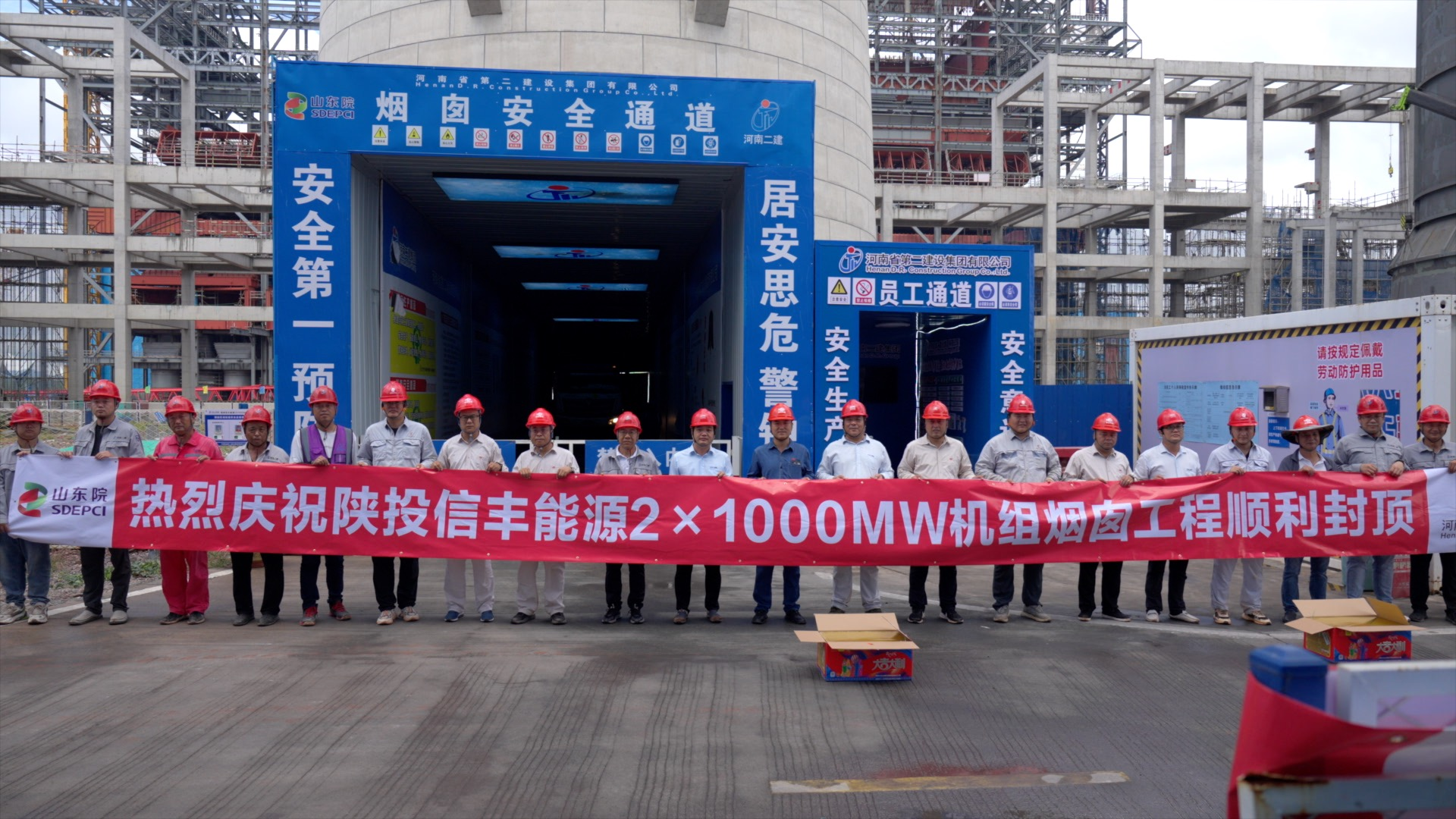 9月20日,陜投信豐能源2×1000MW機組工程煙囪和1號吸收塔殼雙雙封頂、提前完工。